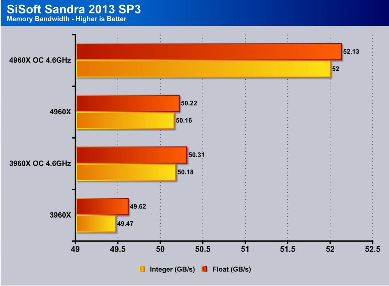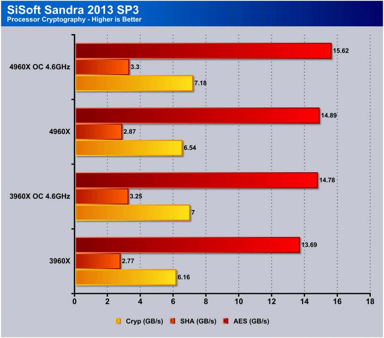 TrueCrypt is a real world application that gives a good indication of the the encryption performance of the CPU and here you can see that once again at matched speeds via the OC setting at 4.6GHz you see about 4.5-5% increase going from the 3960X to the 4960X CPU.