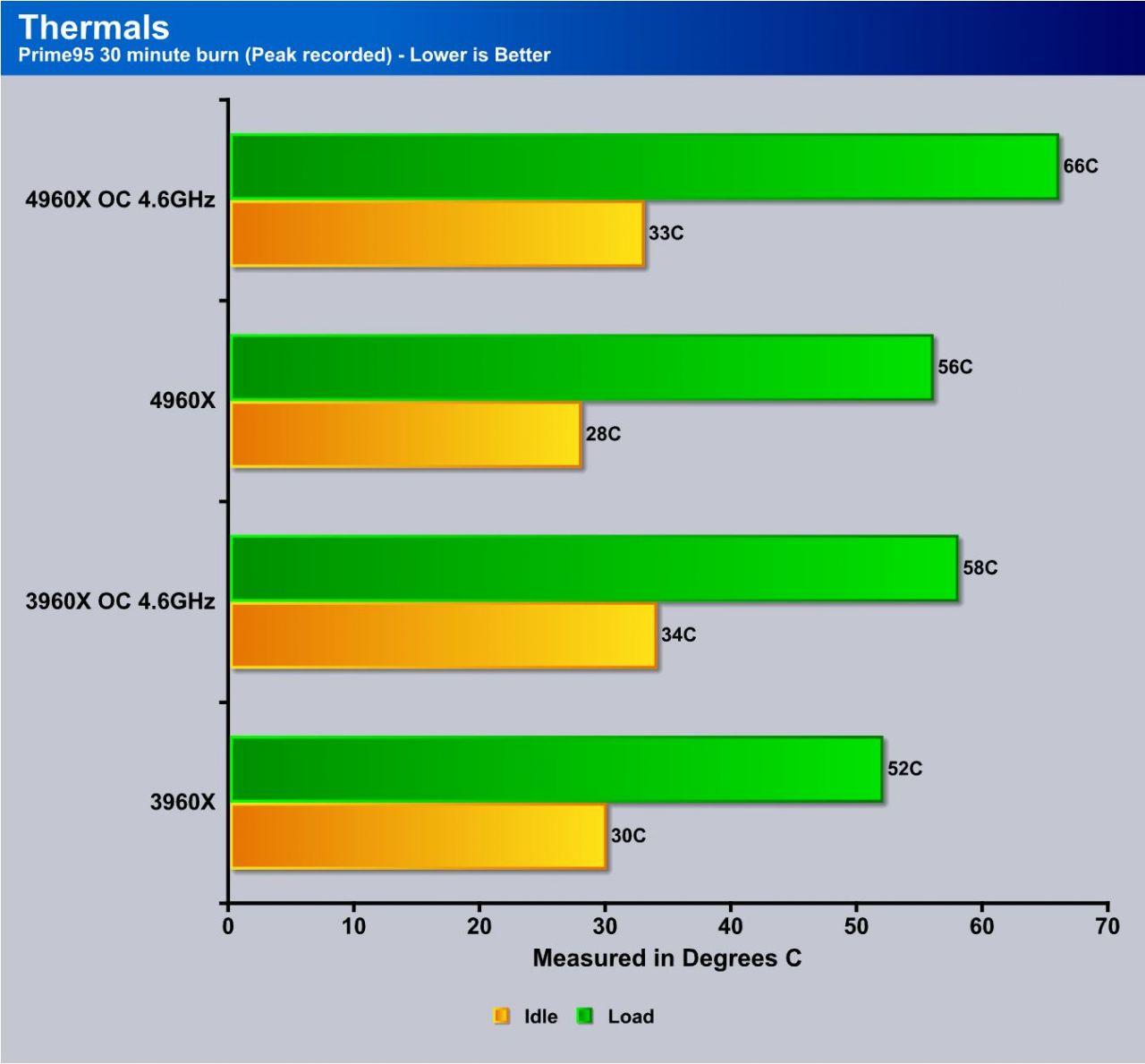 Here you can see that the 4960X idles very cool but under load it definitely can push out some heat but not horribly so even under overclock we did not break the 70C mark but do note that I am using a very high end liquid cooler so your thermals may vary according to voltages required and cooling application used.