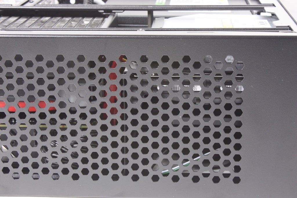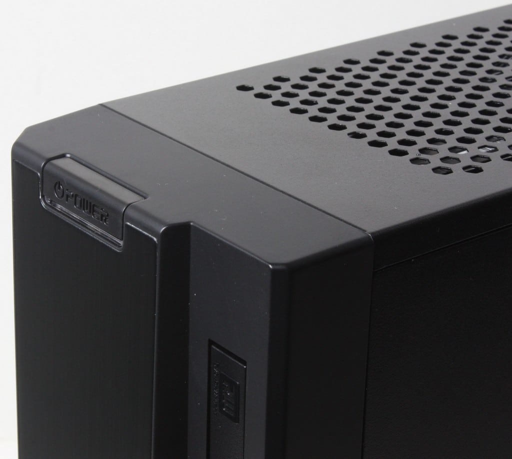 The top front of the chassis is where the power LED and power button are located, they integrate well into the front panel design. Also you can see the edge of the thin DVD multi drive which is vertically mounted as well. One thing to note as you can see here is that the top of the chassis has large opening grille at the top of the chassis to allow natural rising and exhausting of heat from the components from the chassis and this actually works quite well as during long term testing you can feel warmer air rising out of the system.