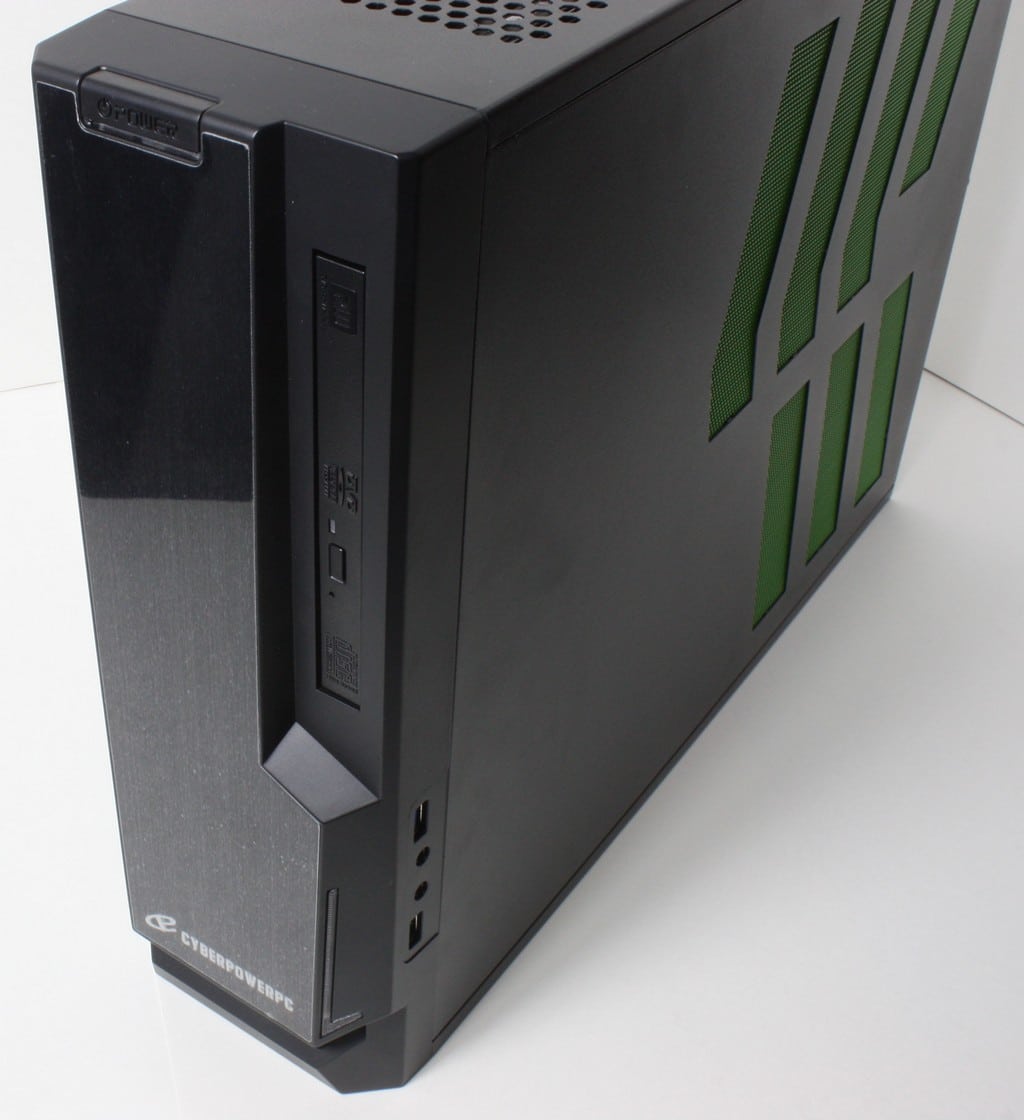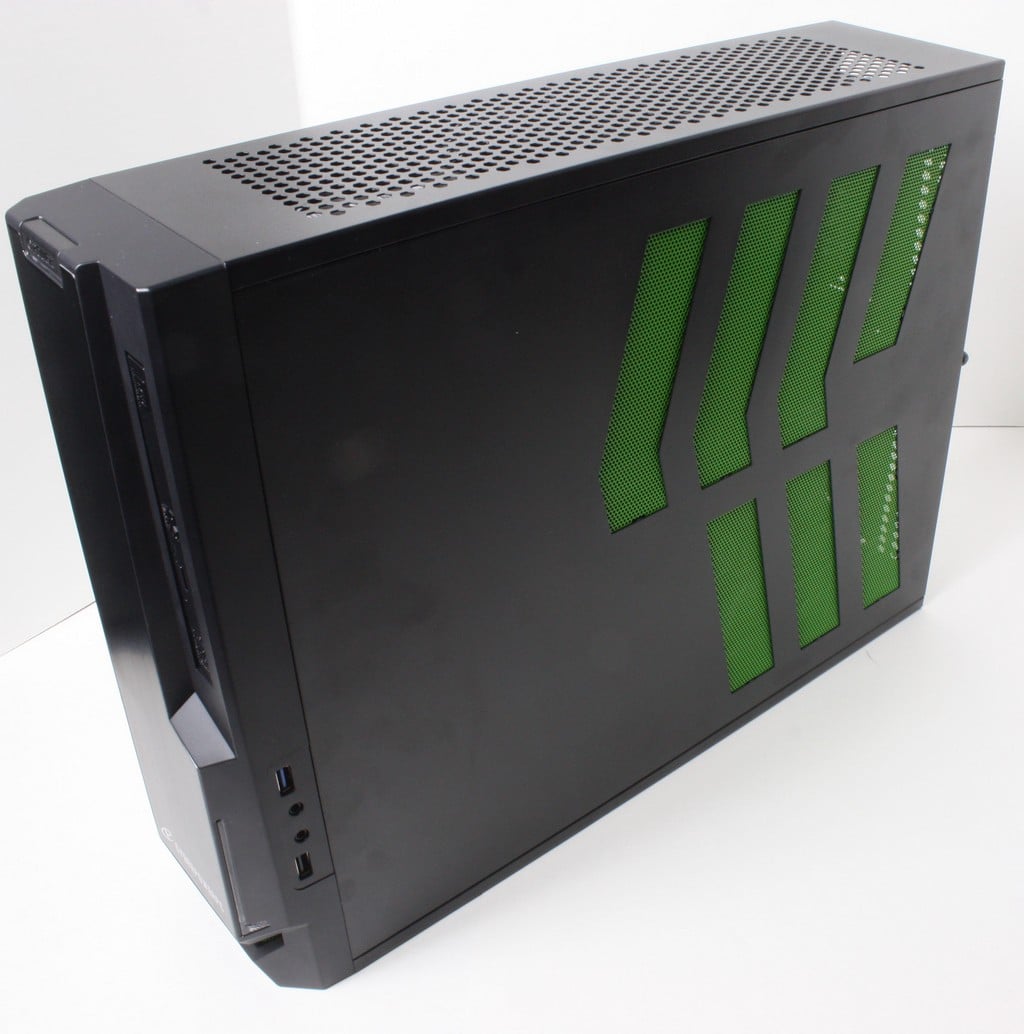 Here you can see the chassis tall and thin with Green highlighted grilles on the side panels. These do look nice but as you will soon see are actually functional for venting to internal fans and components. The Zeus Mini employs a slim DVD drive which allows for even better component fitment due to the much smaller optical solution and although optical drives are going away pretty quickly I still would not call them completely dead as not everyone has moved to complete flash storage for a solution so there are plenty of users still reloading or installing from a disc.