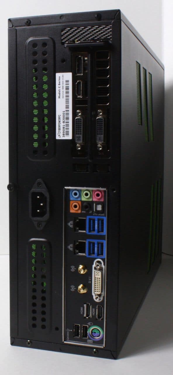 The front panel has a black brushed aluminum sheeting which makes for a very clean look once the covering film is removed and is also embellished with a Cyberpower logo which is done quite tastefully as it is small but still gets the name into view. also you will see a small green accent grill below along with some clear plastic which is backlit by a green LED when powered on.