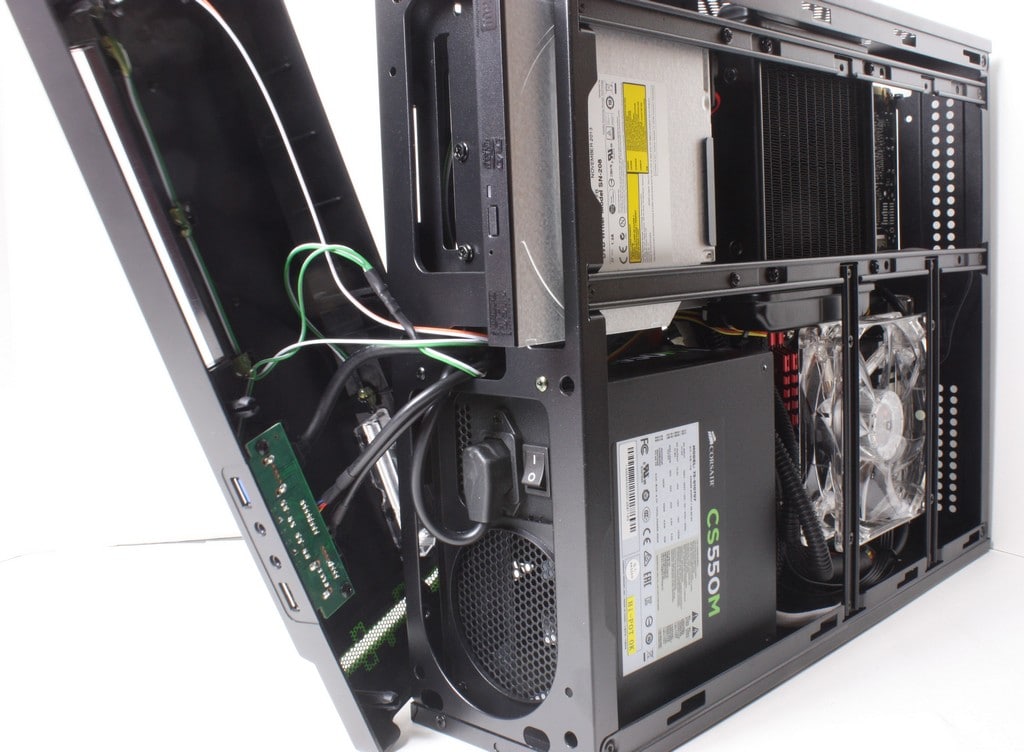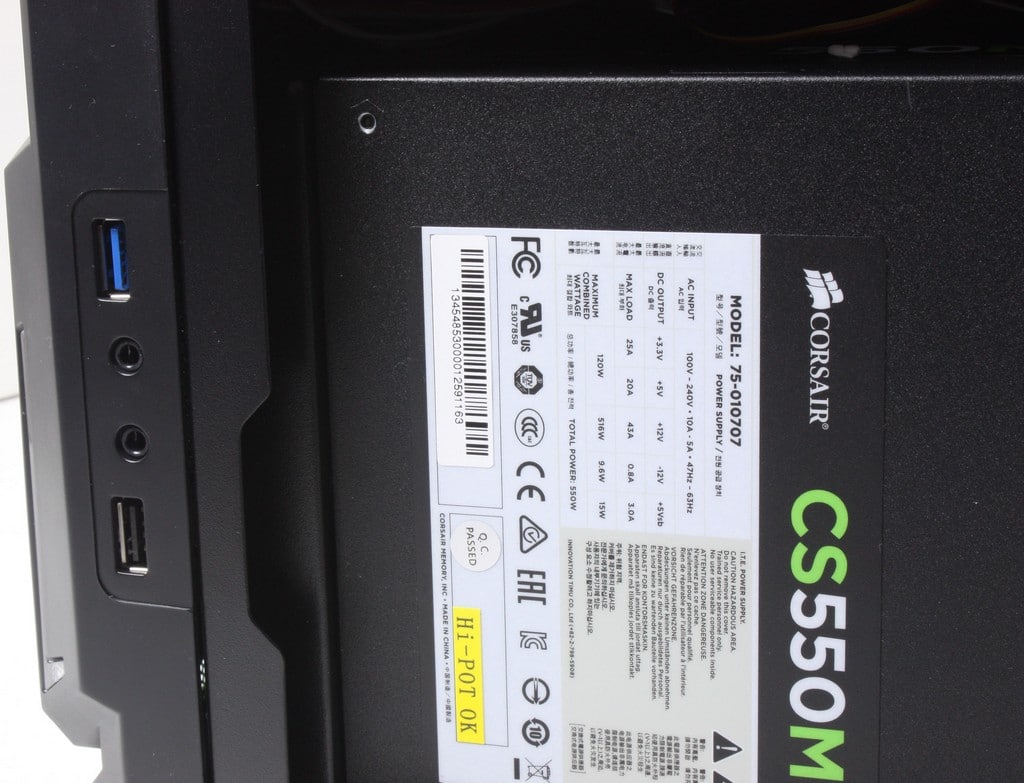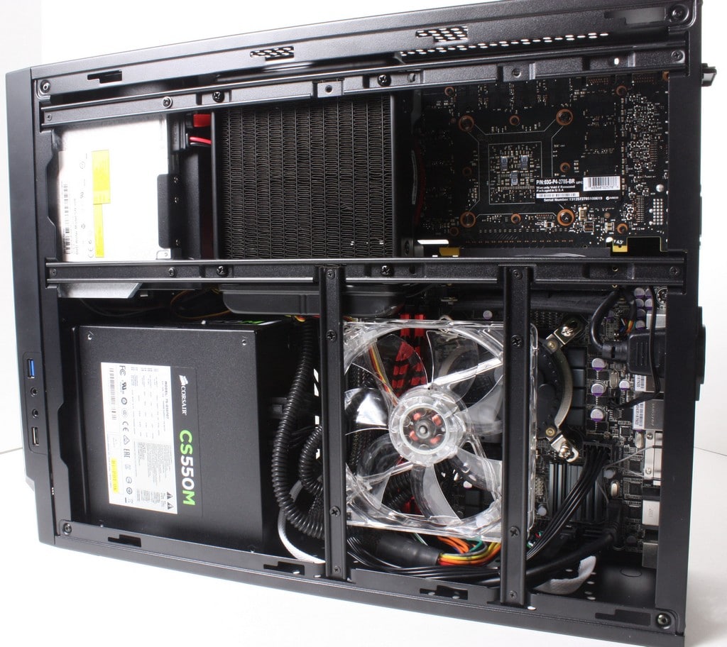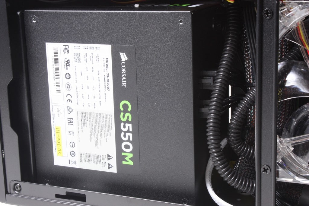 The PSU included in the unit is a Corsair CS550M unit which is mostly modular unit minus the 8 pin ATX and 24 Pin main ATX power connectors. This really helps ensure that cables are minimized as the simple fact is that there is not really anywhere to hide cables except tucked in unused drive bays or in between the PSU and mainboard. The 550 shown here has plenty to support pretty much any card you can put in it so once again you can build a pretty wild machine in this mini rig as you see here it has a 780 which is more than enough to play most any game at very high settings at HD res but we will get to testing soon.