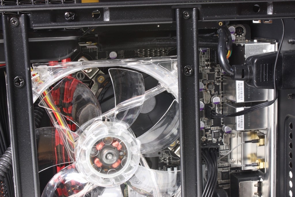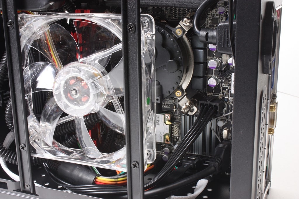 Peering inside you can see above the motherboard Cyberpower wanted to make sure airflow covered the critical components such as the Memory, VRM and chipset so they installed a large quiet fan over them which as you can see here is clear plastic and when the system is powered on it glows green which matches the accent of the rest of the system. The major advantage of this is that normally in small chassis like this you can get hot spots due to low airflow but Cyberpower thought ahead with this and employing that fan allows all of the critical board components to get a fresh blast of cool air as a good portion of it is actually drawn from the side green grilles we looked at before.