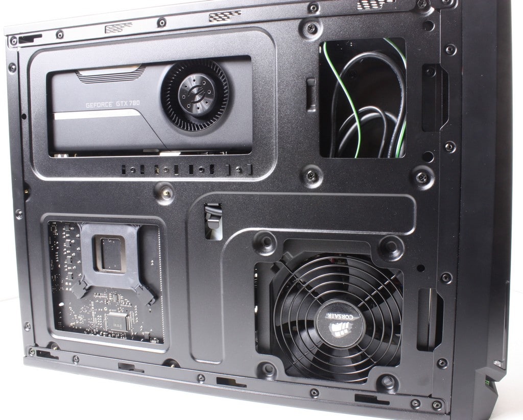 Flipping to the opposite side panel you can see that there are openings for the GPU fan feed which coincides with the side green mesh to allow inlet of some cool air into the card while exhausting heat from the rear IO plate to keep the interior of the small chassis free from extra waste heat. Also here you can see that rear of the CPU socket is relatively accessible or best you can expect along with air feed for the PSU cooling as well. Up top in the drive bay area you can see some slack cable in here to avoid the clutter in the visible areas.
