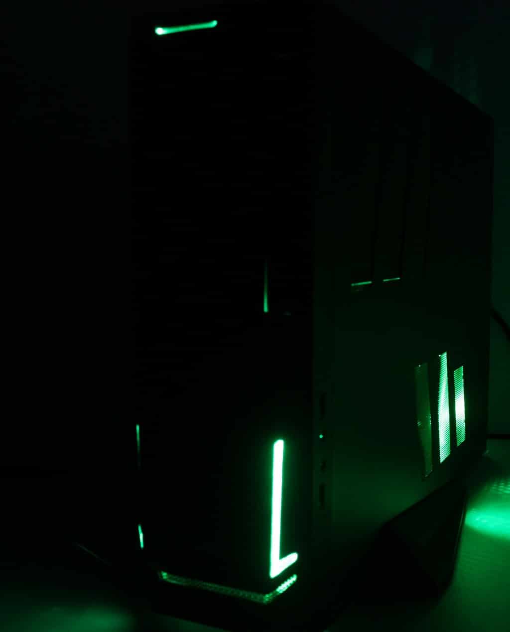 Lastly we wanted to show you what to expect with the lighting from the chassis so we setup a bunch of photos at different exposure lengths with the room lights off and visually compared them to find which one best matched what we saw with our eyes so as you can see here the LEDs are not super bright but do emit a green glow which looks quite cool when in operation and even in your rom I don’t think would be much of an issue if you left it on overnight. Unless of course you sleep with your pc directly in front of your face at which point you might want to move it.