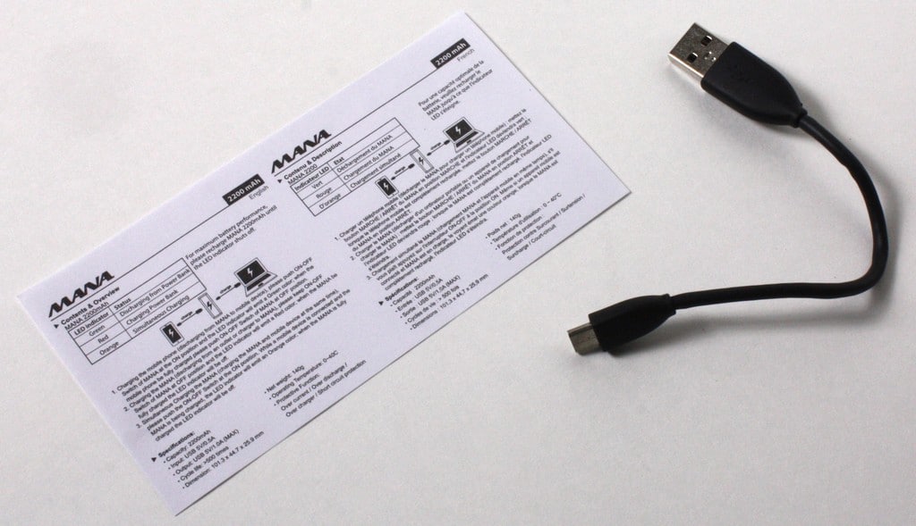 Inside, you find the accessories are a instruction guide which is super simple and a USB to Micro USB cable which can be used for a android phone and also can be used to recharge the battery unit. IF you have a different connector such as an apple based product you would need to use its cable for this as the MANA only comes with the Micro USB style cable.