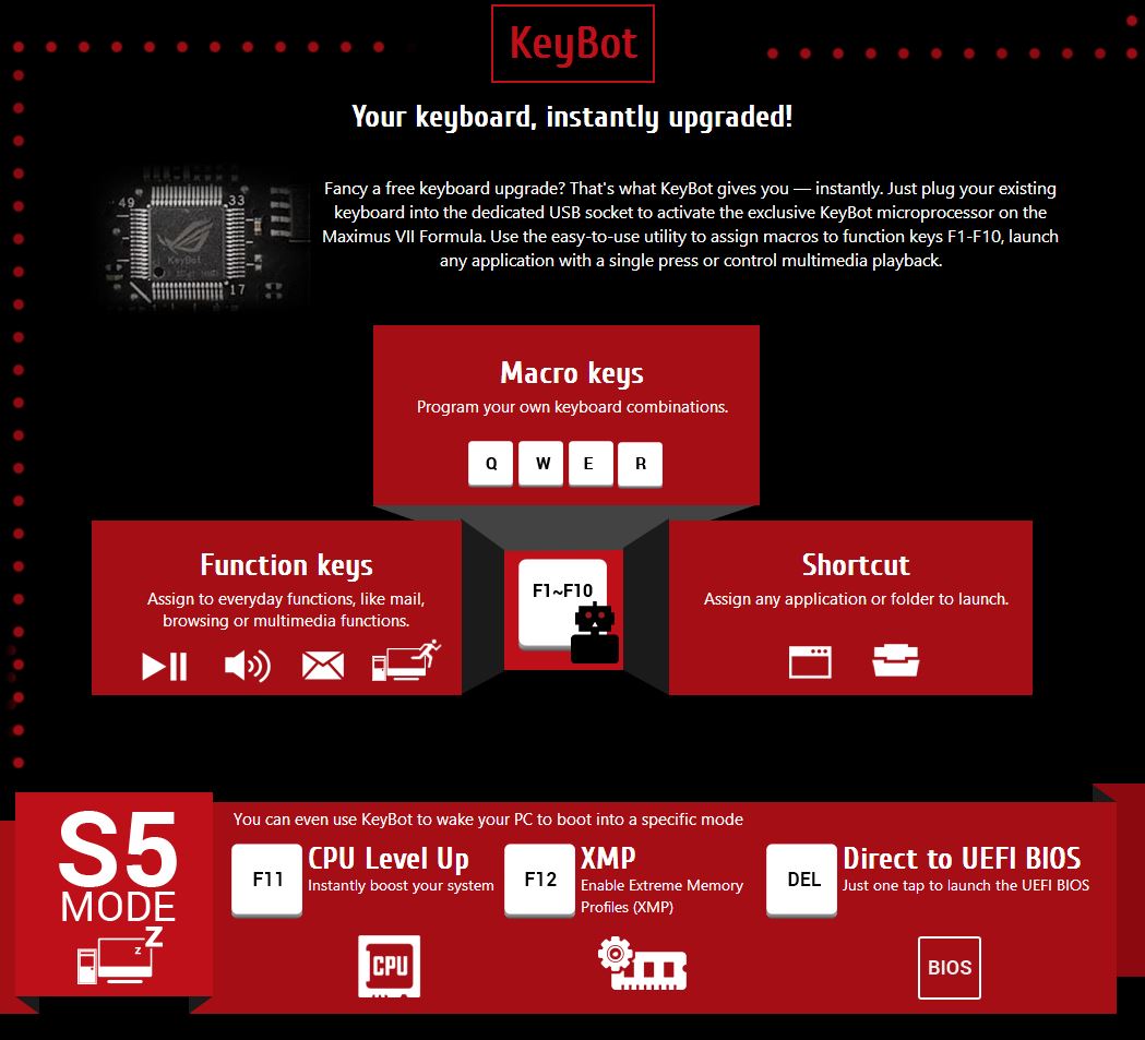 ASUS has introduced a totally new feature with the Maximus VII Formula with the name KeyBot, this allows a keyboard that is plugged into the KeyBot port to now be assigned macro combinations on any keyboard eliminating the need for a special keyboard with onboard memory to have macro capability. This is very interesting as I see some huge benefits to this as now any cheap USB keyboard can have full macro capability like a more expensive unit, but at the same time since this is the first iteration it will take some extensive testing to see exactly hwo well it works and what are the limitations of the functionality based on the keyboard used among a whole host of other factors.