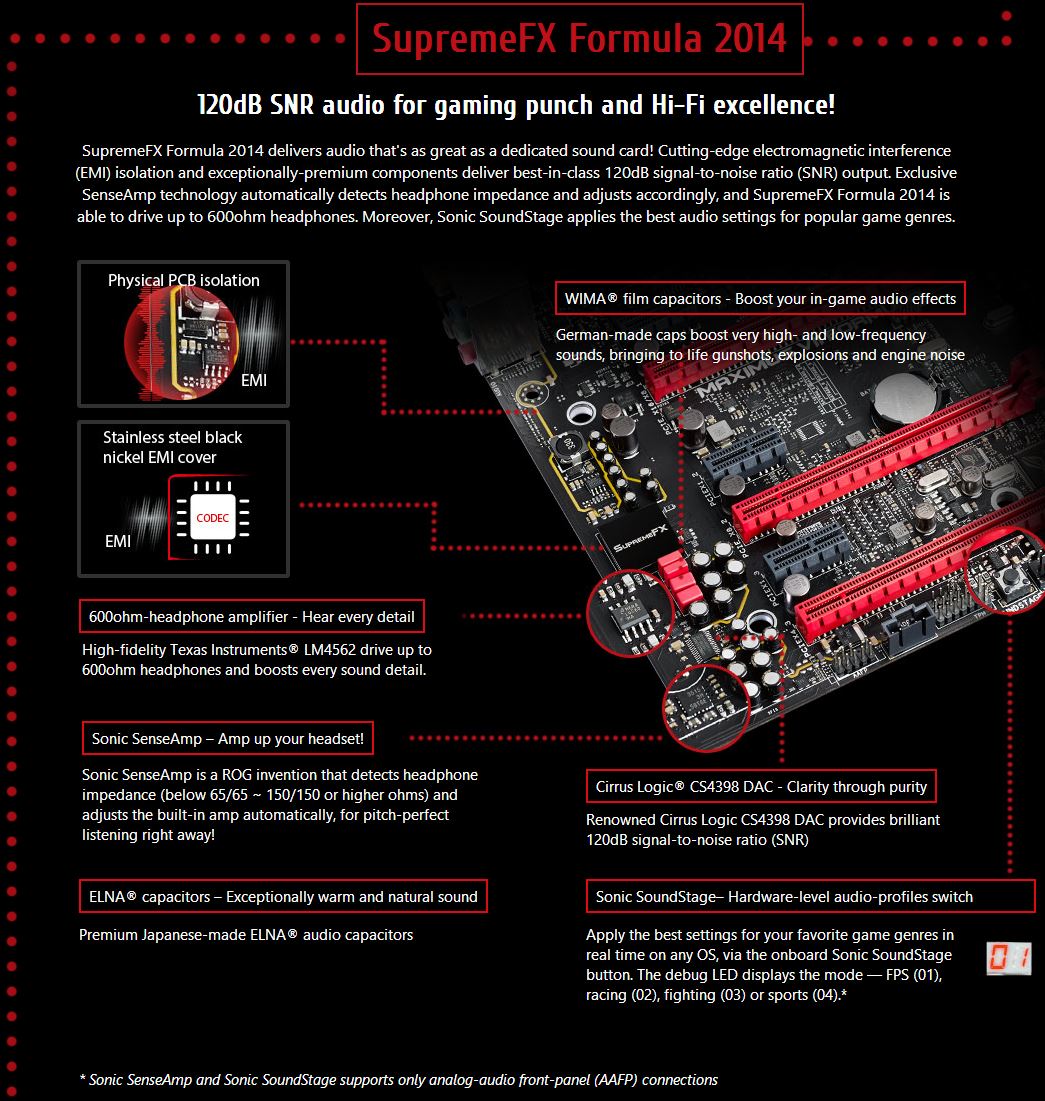 The SupremeFX audio solution is something that I can no longer quantify as a unit which means a single or defining style which now SupremeFX carries multiple designs depending on the board. I guess if anything I can call this the newest iteration of the SupremeFX Implementation which carries similar design styling and even some similar components as previous Generations but there have been some upgrades since then. Things which are most noticeable would be the addition of the large red Block style WIMA Film Capacitors which are specially tuned for audio to enhance crisp detail such as gunshots and footsteps and these are used in conjunction with ELNA caps which much like previous gen applications of the SupremeFX designs offers a much fuller sound in your gaming environment. Also the SupremeFX Codec shielding, Op Amp and even the Red Line shielding are all in place to offer the best possible audio experience for extreme gamers looking for the very best they can get.