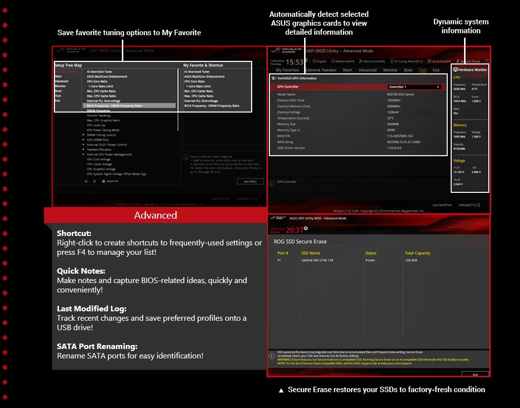 ASUS has performed a lot of testing when it comes to a high performance machine. One thing that has been noticed is that as SSDs have matured we have seen that over time performance will degrade and drives basically fill up some and rewrite data and basically just start to get junked up and performance starts to fall off. Well the solution has been found to perform a secure erase which writes zeros to the whole disk creating an entirely new fresh disk data area. This is a great solution but the problem is that many users do not know how to burn the Linux live CD or even more how to navigate the many options to perform the secure erase. ASUS once again offers a unique solution via a integrated UEFI software to secure erase an SSD to restore it to like new performance.