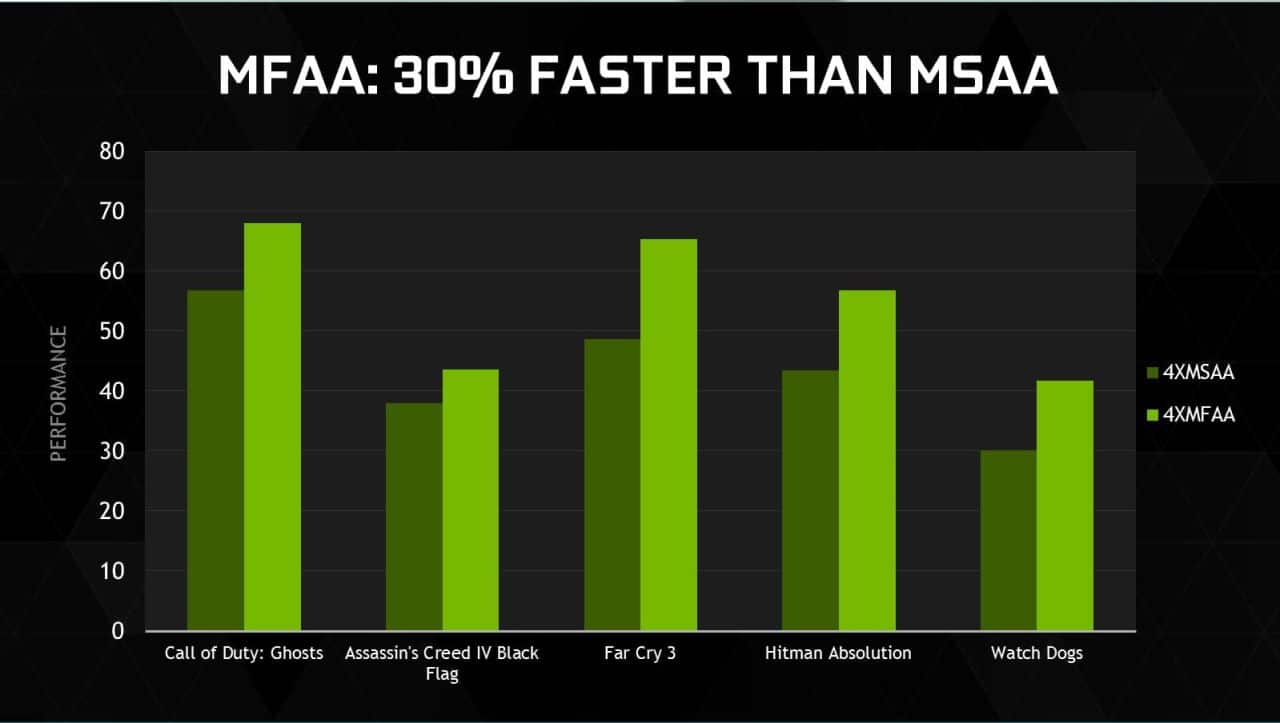 MFAA is a new AA which allows for extreme performance as stated above while still offering awesome image quality. Obviously we all know that enabling or cranking up AA can really bog down your graphics card so Nvidia has been actively pursuing new AA techniques to lighten the load on the graphics system while still offering good performance. One great thing about MFAA is it allows per pixel changes rather than much larger areas whcih means a much better finite level of control over the smoothing of edges and a better overall picture quality while still offering less load on the card and better framerates.