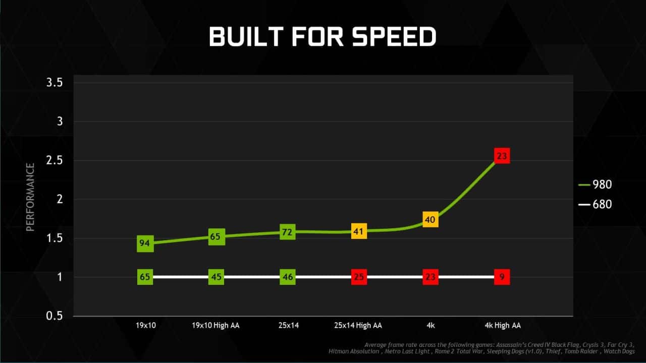 Here per Nvidias PR info you can see that the GTX 980 when compared to a 680 holds its own even in parallel with the 680 albeit higher performance until reaching 4K levels where the 980 take a commanding lead, but a interesting development is with MFAA enabled the lead grows. as for what MFAA is we will go over that very soon a little further into this overview.