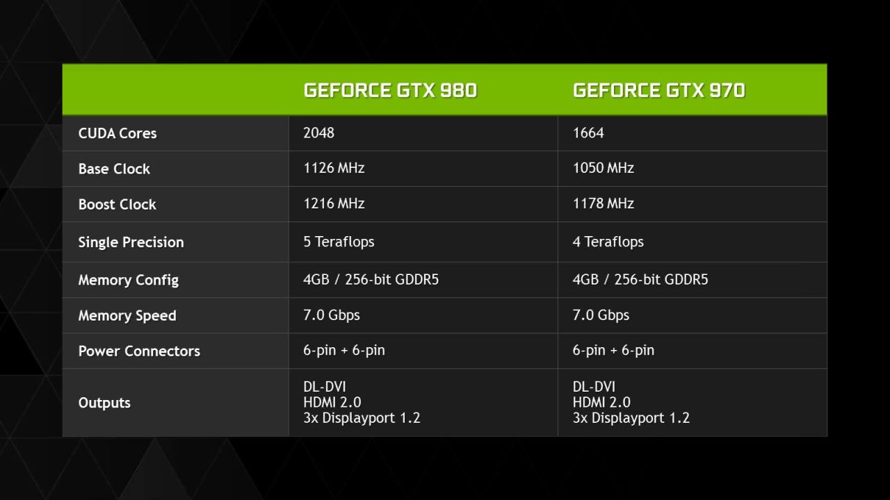 Here we can see the comparison between the two new Maxwell models both of which come with 4GB frame buffers running on a 256-bit bus. One very important inclusion to note here is the HDMI 2.0, and with the recent announcement of Vesa updating Displayport spec to 1.3 I do wonder if this will be updated in the near future as supported on the 9 series as well. The HDMI 2.0 allows a massive amount of bandwidth on the HDMI connection which enables 4K at high refresh along with many other audio multistreaming features which allow for more flexibility in AV implementations.