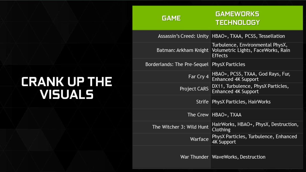 Here you can see some of the newer titles and the Nvidia features they support as part of the Gameworks implementation.