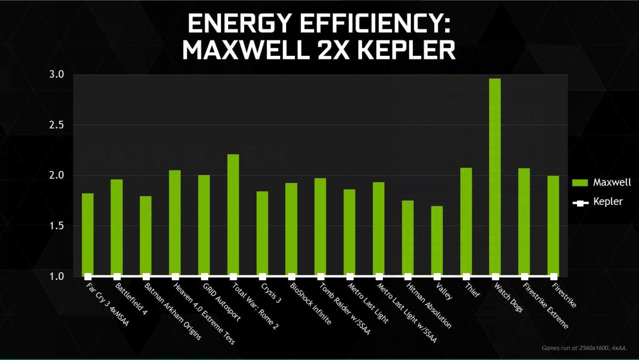 Here you can see the efficiency number in real world apps such as games like Watch Dogs which gets 3x better than Kepler but overall average is as stated 2x with some titls dropping into the 1.5 range such as Hitman Absolution. Overall if this holds true this is super strong for this new GPU and means very powerful new cards that are not super power hungry. From my calculation this could also mean should a extreme power user link these up in 4 Way you woudl not need a crazy 1500W+ PSU to run them I plan to confirm what the limit is soon when I can get my hands on 4 samples to see just how low you can go on a PSU.