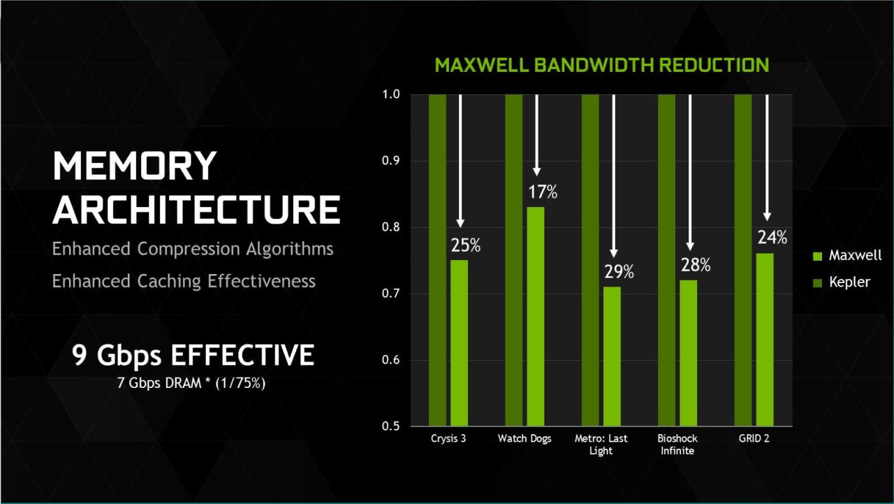 Due to the lightened load on the framebuffer, Nvidia did the calculations and found that in order to get equivalent memory performance from Kepler you would need to run your VRAM at 9Gbps speeds to match the performance on the stock 7Gbps speed you have on the 980 with the compression and load savings on the bus.