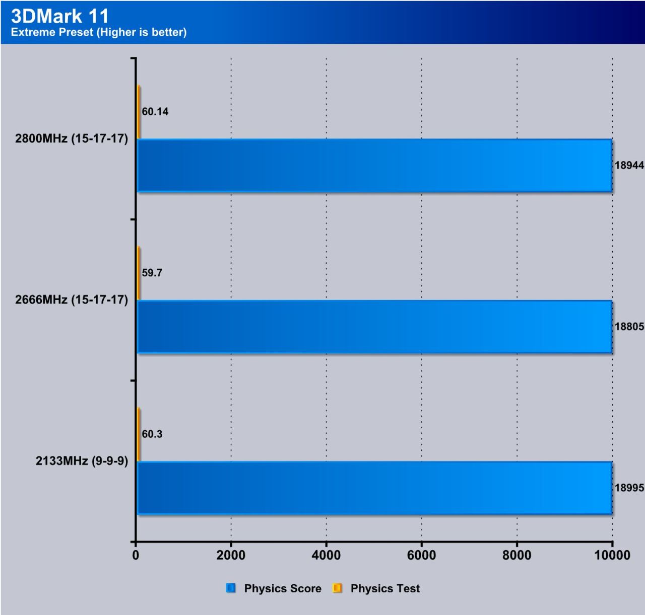 3DMark 11 is a nice synthetic benchmark which represents 3D gameplay. here you can see tha th ephysics scored well on JEDEC but actually lost a little bit of performance when turning up the speed but I believe this may still be sue to poor optimization.