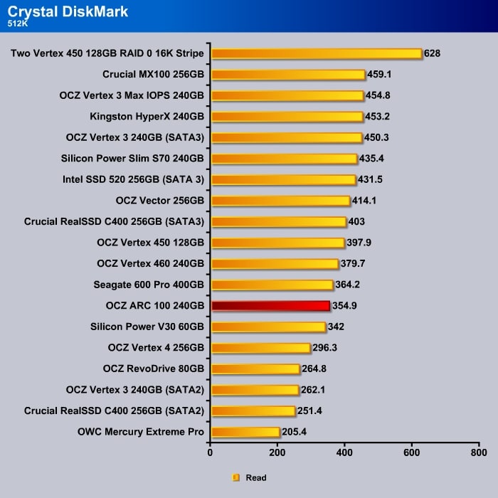 The ARC 100 does well in the 512K write in CrystalDiskMark, beating out the MX 100 and just trailing behind other Indilinx Barefoot drives.