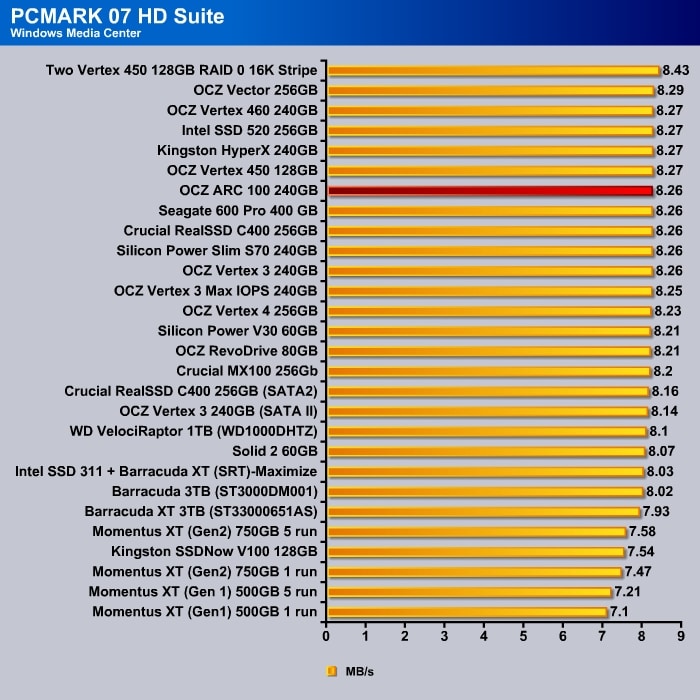The ARC 1000 scored 5200 points in the PCMark 7 HD suite test. This is ahead of the Vertex 4 but behind the ARC 100 and the more expensive 240GB drives. The drive would still offer you great performance compare to any mechanical drives or even the hybrid drives.