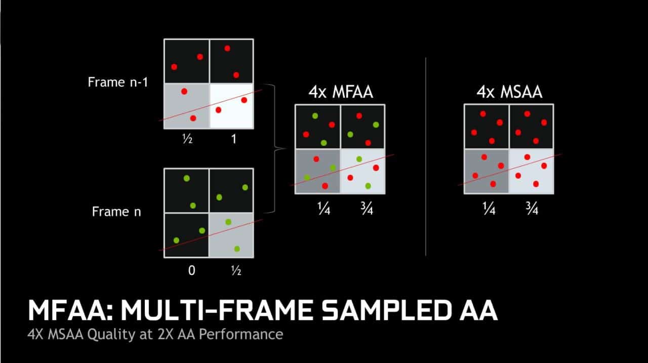 MFAA is a new AA which allows for extreme performance as stated above while still offering awesome image quality. Obviously we all know that enabling or cranking up AA can really bog down your graphics card so Nvidia has been actively pursuing new AA techniques to lighten the load on the graphics system while still offering good performance. One great thing about MFAA is it allows per pixel changes rather than much larger areas whcih means a much better finite level of control over the smoothing of edges and a better overall picture quality while still offering less load on the card and better framerates.