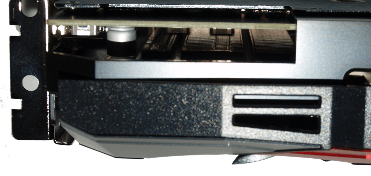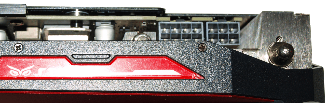 From this angle you can see how recessed the PCI-E power connectors are, this top mounting arrangement needs a notch in the PCB to work and is stationed between two heatpipes and a little tricky to get the power connectors in. The proximity to the PCB makes you feel like you need to exert extra care not to damage that center PCB and the cables will rooster tail out of the top of the GPU. Being a full length card that’s pretty normal but we can still wish for end mounted connectors that don’t shove the cables up toward the window in windowed chassis.