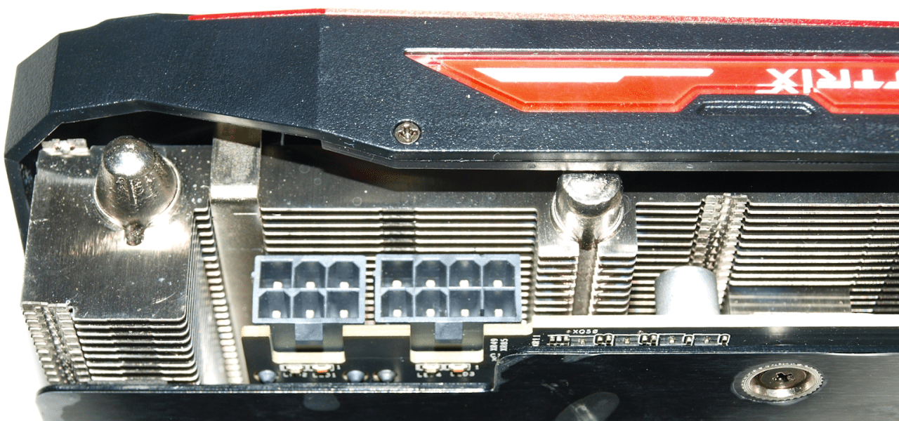The Strix R9 390X Gaming 8G OC runs off an 8 pin connector as well as a 6 pin connector both PCI-E of course. The connectors are a bit to recessed and partially down behind the cowling so we flipped the card around and got another shot.
