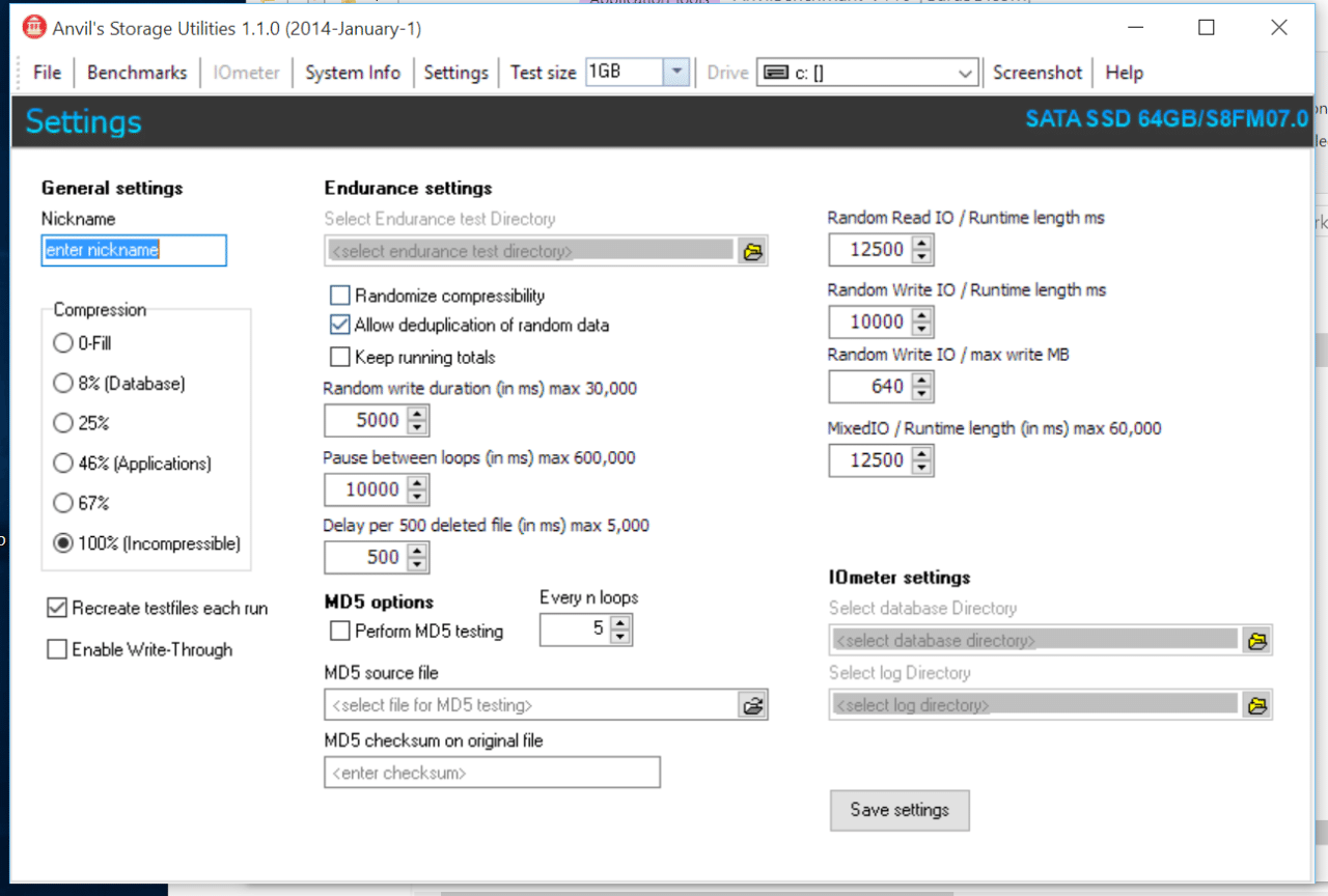 The software allows us to choose how compressed the data is. A 46% compression ratio is a good match to “real-world” data and will give us a good idea how the SSD works during real use.