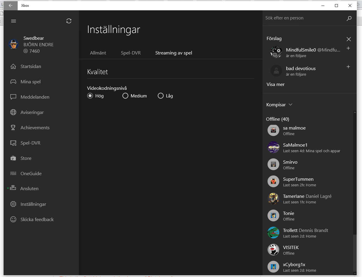 After we set up the Xbox One to accept streaming we just need to use the Xbox app from the Windows Store and connect. We can set up a quality setting (Hög = High, Låg = Low) but that can also be changed while streaming. Then all we need to do is to choose “Stream” and we get connected to the Xbox One and mirror its dashboard.