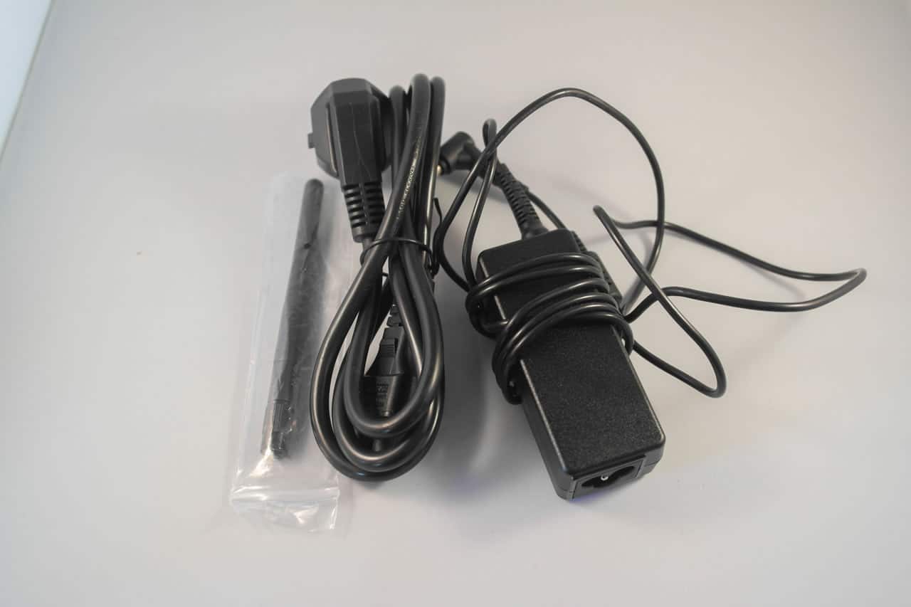 We get a small 19V/2.1A power supply (fan-less of course) and a antenna for WiFi.