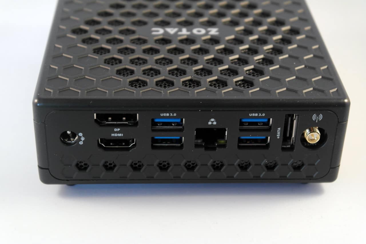 The ZOTAC ZBOX CI540 nano Plus comes with a lot of connectivity options including both USB2- and USB3-ports, gigabit ethernet, 802.11ac and eSata as well as both a DisplayPort and a HDMI port for video output.