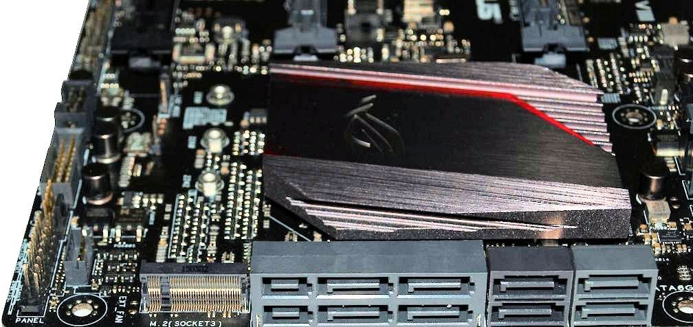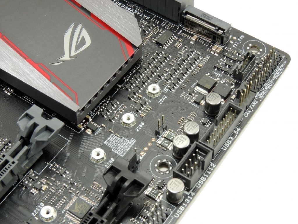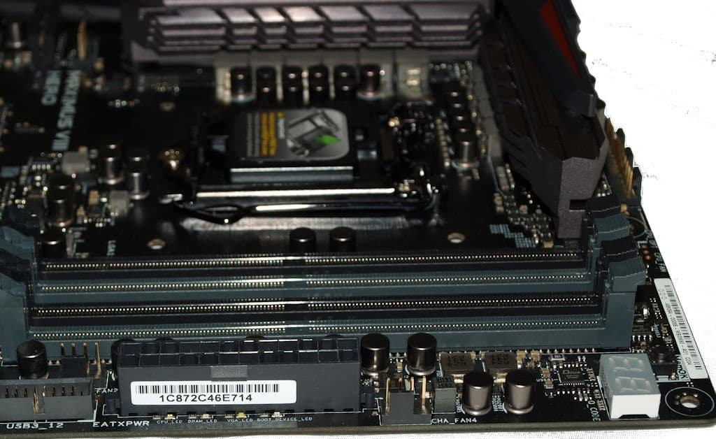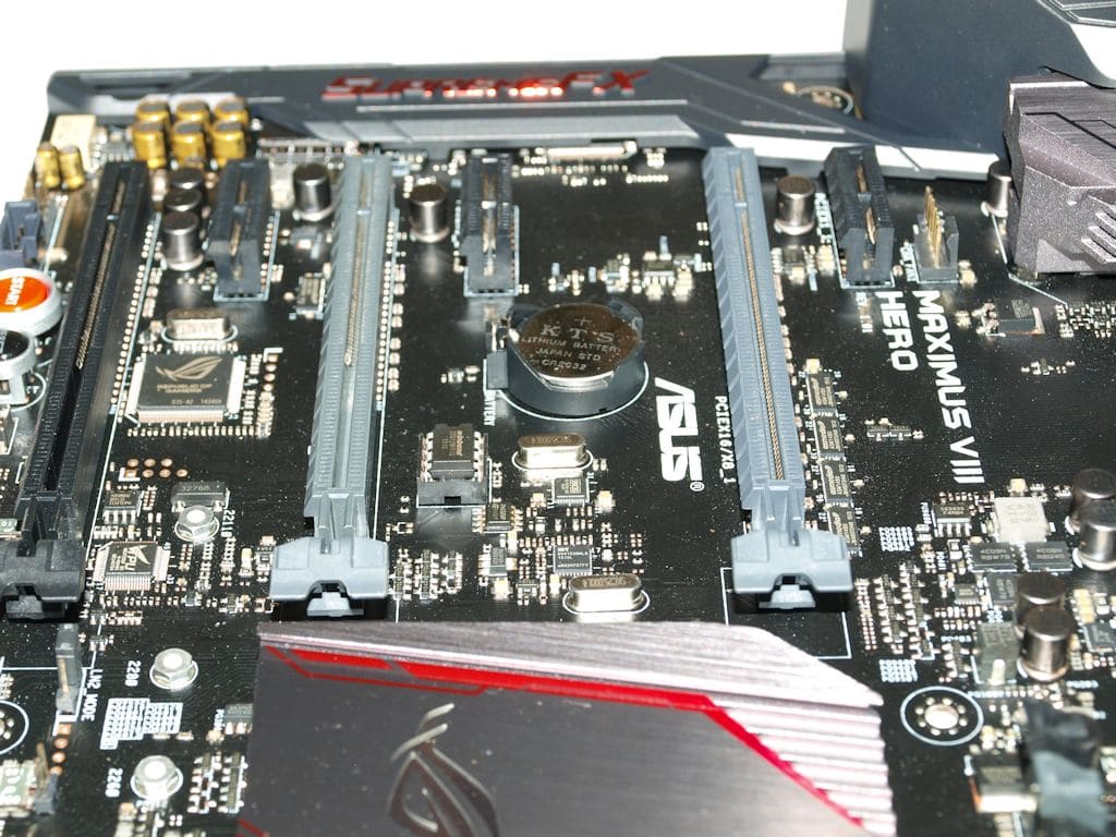 Shown with the yet elusive 6700K installed the Asus Hero VIII features 8 phase CPU power, Microfine alloy chokes and 16k long life solid capacitors. We won’t cast a spoiler yet but anyone thinking 8 phase power isn’t enough just go ahead and do a head slap now. The 8 phase power is plenty for the 92W TDP i7 6700K which is actually 3W less than it’s predecessor the i7 4790K.