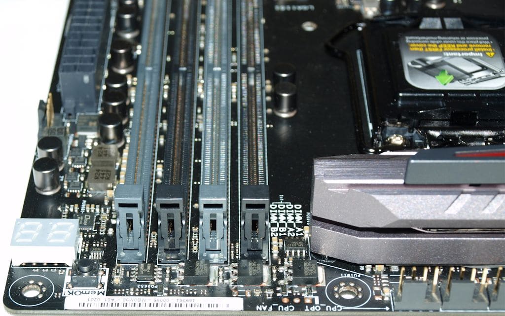 Just left of the CPU power connector you find 3 4 pin PWM connectors, a decent look at the 4 ram banks and the solder points where you can use a multimeter to check voltages. That takes us all the way around the board and back to the Post Code block we like to call the Double Digit Debugger.