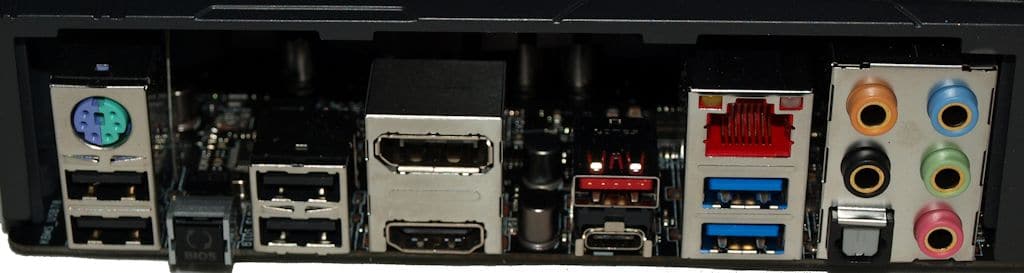 Starting on the left you have the Mouse / Keyboard PS2 so popular among extreme overclockers that run a stripped down OS to achieve higher speeds, Below that is two USB 2.0 ports (the lower port is the USB FlashBack), then to the left the USB BIOS Flashback button, then two more USB 2.0 ports. THe Z107 chipset and the HD 530 IGP support up to 3 monitors but the Hero provides a HDMI and a Display Port which is plenty for the IGP as it’s not for high-end gaming. To the left of the Video you have the two USB ports a Type-C and one Type-A. Moving left an Intel Ethernet port and below that two USB 3.0 and farthest right the gold-plated Audio Jack and the Optical sound port.
