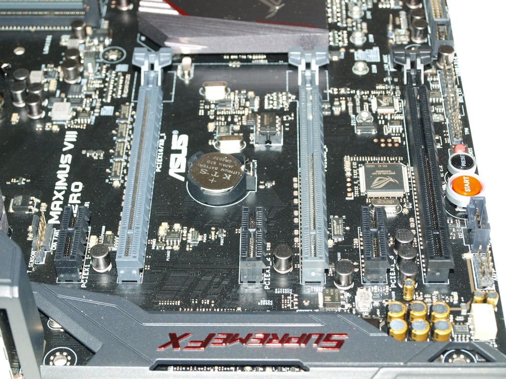Most notably on Z107 and the Asus Z107 Hero VIII the first 16 PCI-E lanes are embedded in the CPU itself and are the Grey PCI-E 3.0 slots pictured above. Here’s the Specifications straight from the Asus Webby.