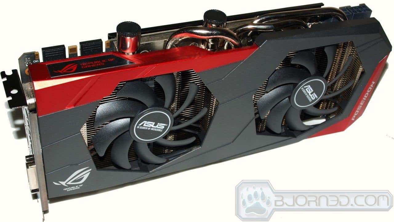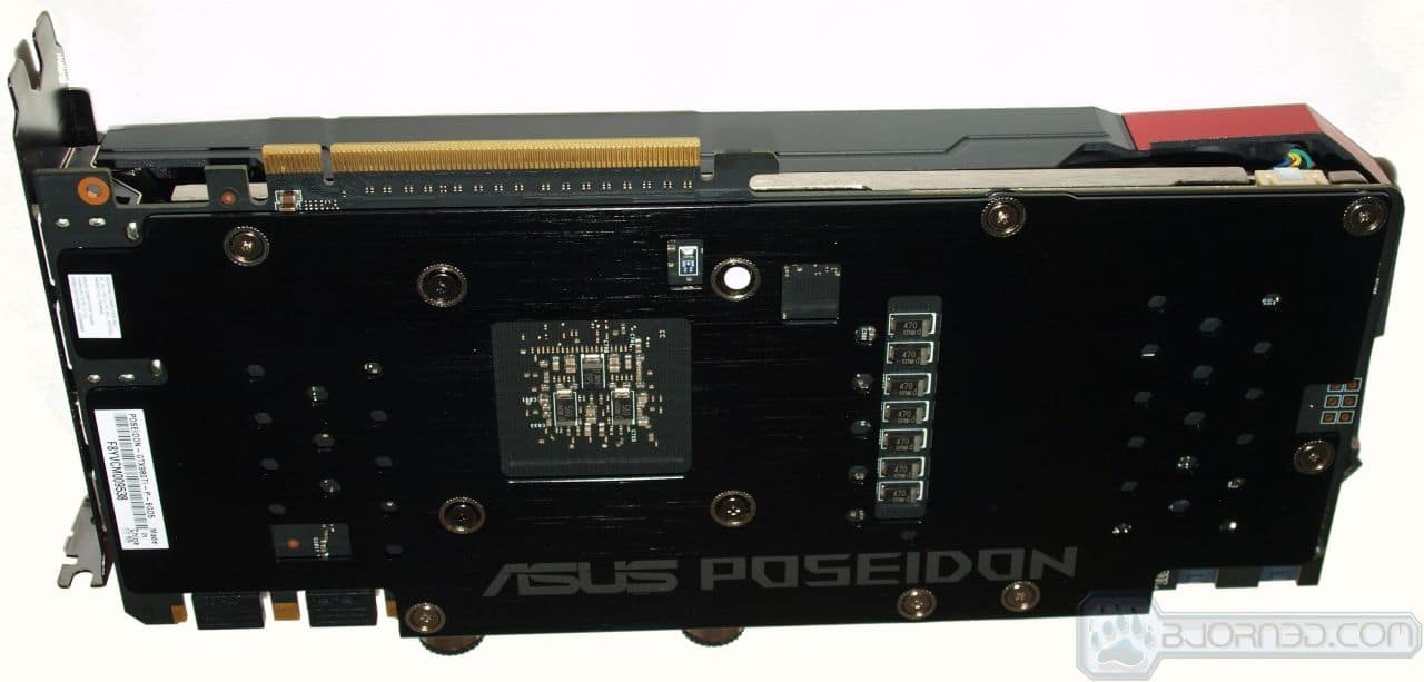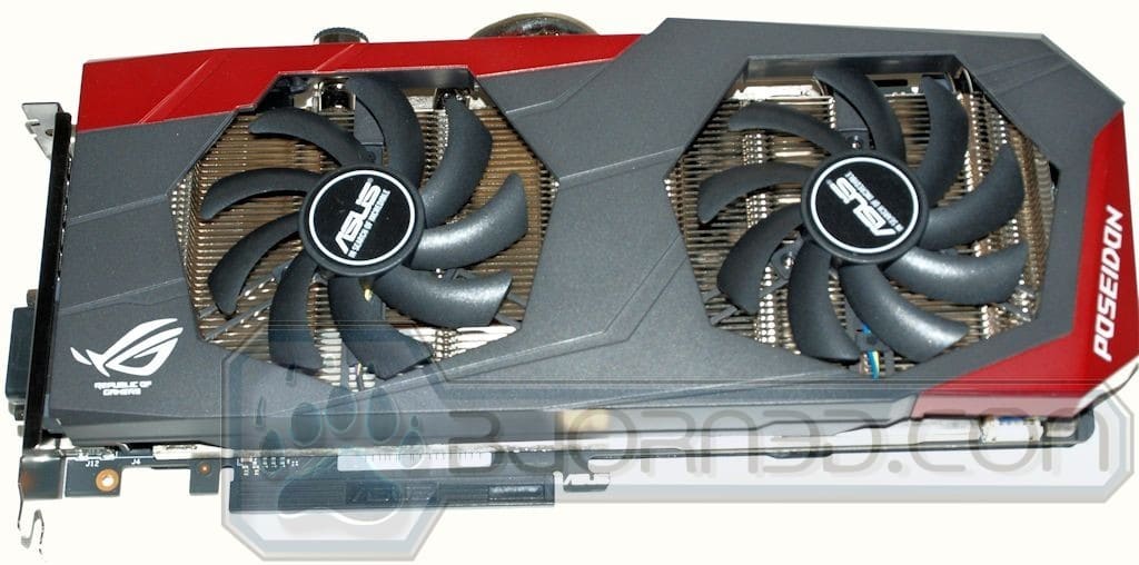 The Asus Poseidon Platinum GTX 980 Ti is a large GPU running 29CM in length with a classic black and Red ROG cowling with the model Name “Poseidon” printed on the end of the monster GPU.