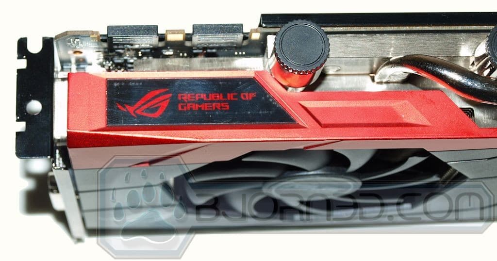 Topped with a ROG logo when the card is in operation you will see an ROG red pulsating light highlighting the ROG Logo. Across from the logo you find the standard SLI Connectors allowing for multiple GPU use.