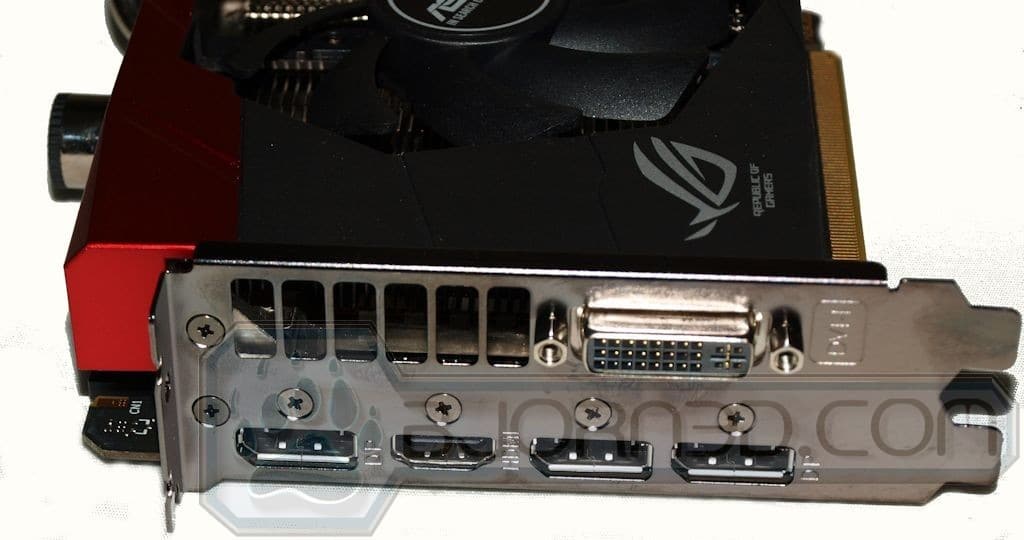 The Asus Poseidon Platinum GTX 980 Ti comes with 5 video output ports: 3 Display Port, a HDMI and a DVI connector. Display port is the obvious choice for the Asus Poseidon Platinum GTX 980 Ti but the sheer amount of legacy monitors makes leaving off the DVI and HDMI a hard choice so this combination of connectors is pretty standard on enthusiast cards.
