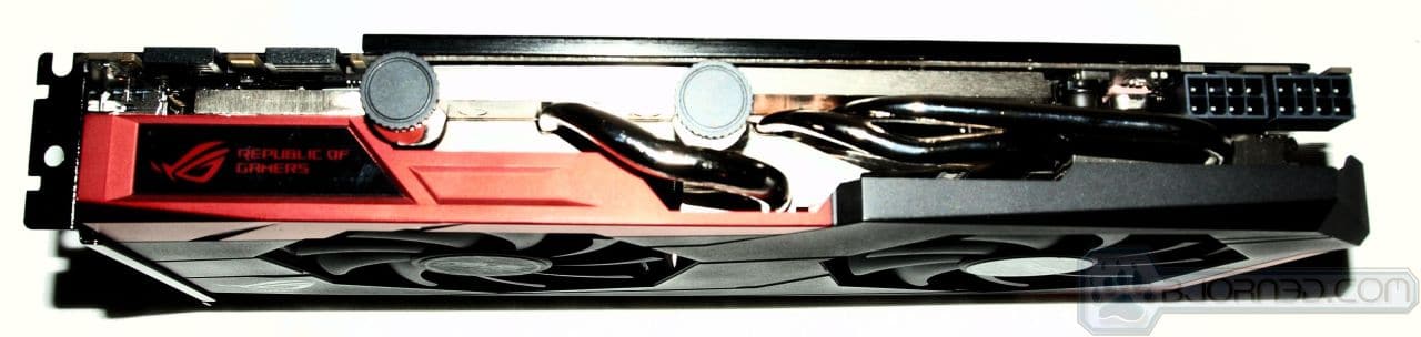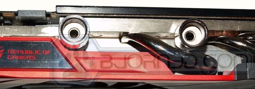 Shown from slightly above you can see the water inlet port caps and the air cooling heat pipes which will provide a unique and extremely effective cooling solution allowing for a cooler running card and hopefully some overclocking headroom as well. You will find the Air cooling solution on the Asus Poseidon Platinum GTX 980 Ti is perfectly adequate but if you don’t plan on water cooling there are other Asus models (like the Strix) you may want to consider.