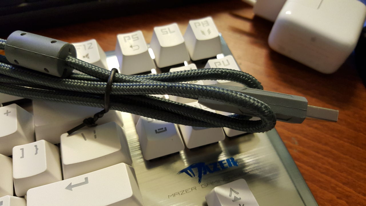 A regular braided cable (1.8 m) is included. Unfortunately there are no USB-passthrough on the keyboard.