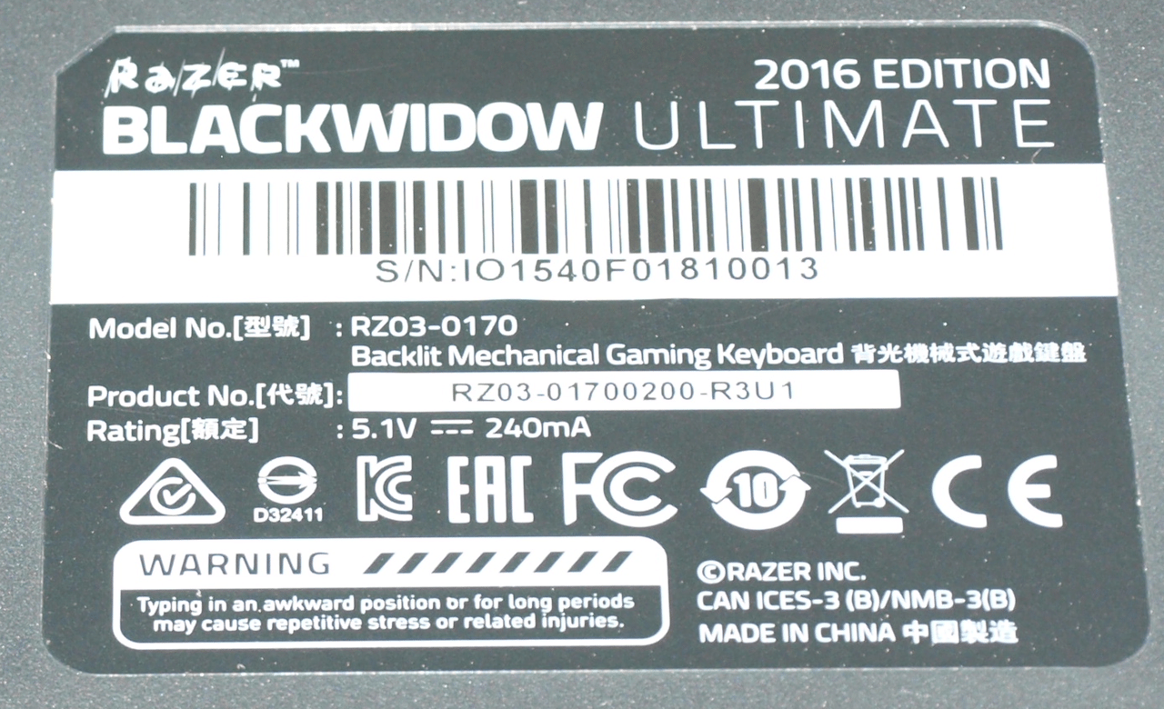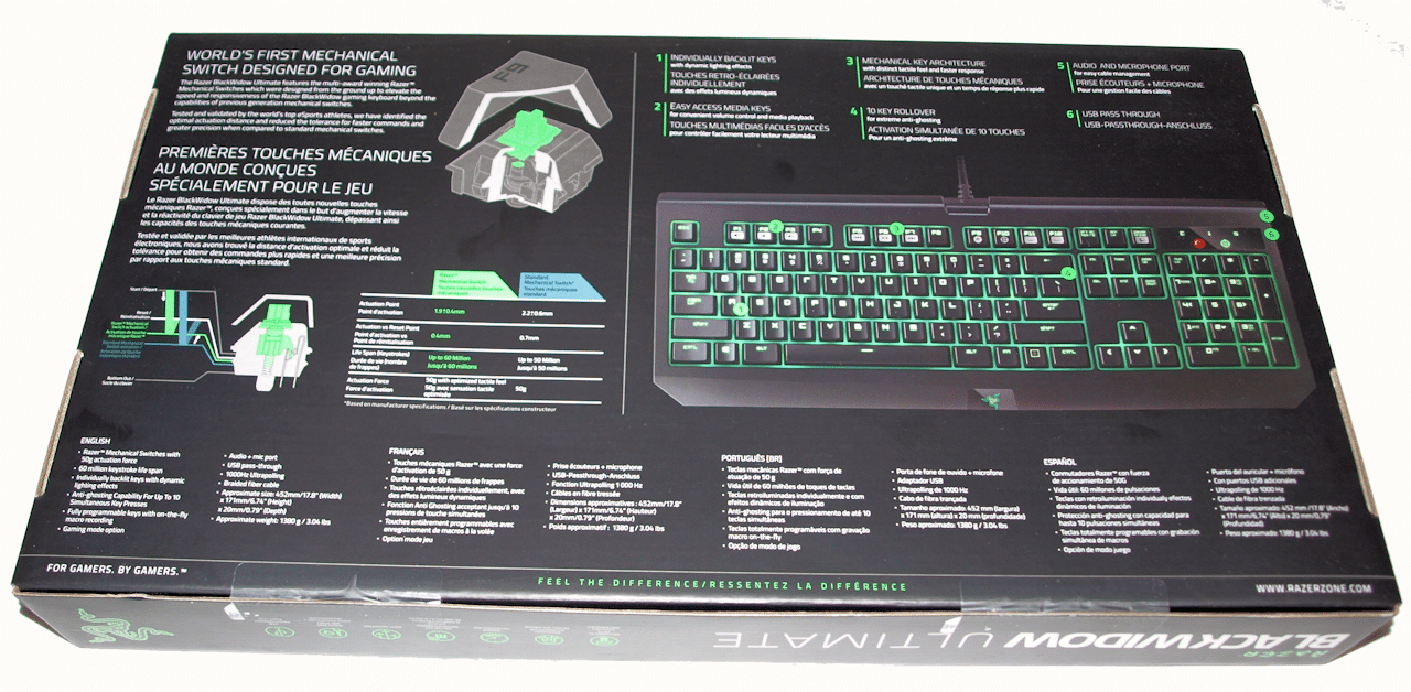 The back side of the BlackWidow Ultimate lauds the Razer designed Green Clicky mechanical key and gives the specifications for Razer Keys and what they consider normal mechanical keys. In general there’s plenty of info on the box to help consumers make an intelligent choice about the purchase of the Razer BlackWidow Ultimate 2016 Edition. The information will help in a go in blind retail setting but most gamers are going to the web to make their decision.