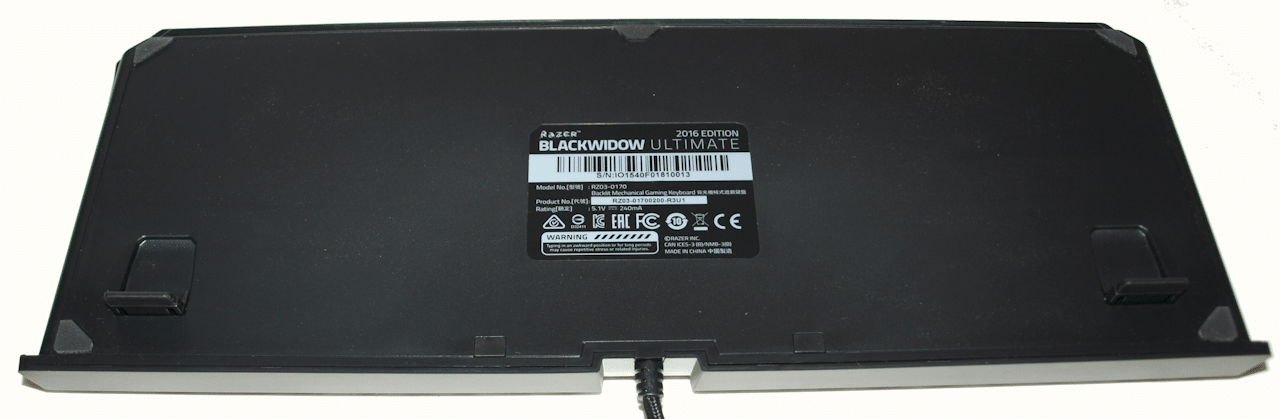 The back of the keyboard has two keyboard stands for those that like an angle on the keyboard and it has the Razer product sticker.