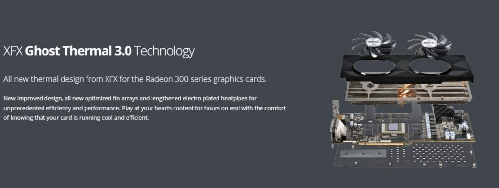 Ghost Thermal 3.0 Technology features an all new improved fin arrangement with lengthened electroplated heatpipes passing through the full coverage heat sink giving unprecedented cooling and efficiency. Now this graphic shows a metal backplate and unless someone forgot to put one on our card the XFX R9 380 4G DD Black Edition doesn’t have the backplate but the heatsink / fan arrangement is the same.