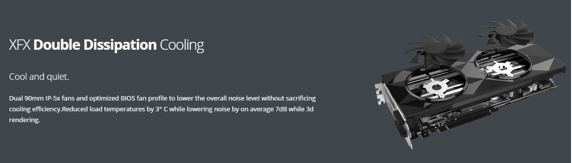 Dual 90mm IP-5X fans and highly optimized BIOS fan profile gives you a lower noise level without losing cooling efficiency. XFX claims a 3°C reduction in load temps as well as a 7dB reduction in noise while 3d rendering. From our previous experience with the DD coolers we have no doubts what so ever that XFX strapped on a highly effective highly tuned cooling solution and as a result we got great thermal properties and quiet operation.