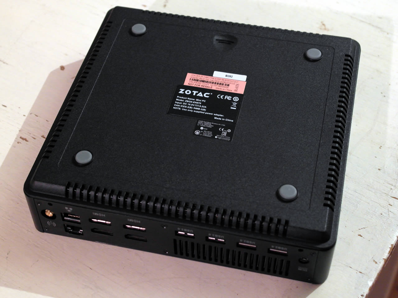 As we turn the PC around things get a big interesting. We get two USB 2.0-ports and two USB 3.0-ports. So far so good. The dual Ethernet ports is a bit surprising since that is what you often find on a bit more expensive motherboards. The four(!) HDMI-ports however are not something you usually find on a PC. We get the impressions Zotac just decided that instead of offering either a regular DBI-D-port and/or a DisplayPort-port it would be fun to put four HDMI-ports on the PC. It kind of make sense though. If you want to use the PC with many monitors you most probably will stop at 1080p resolution on each screen and that works well with HDMI and HDMi also is a connector you find on basically every monitor and TV now.