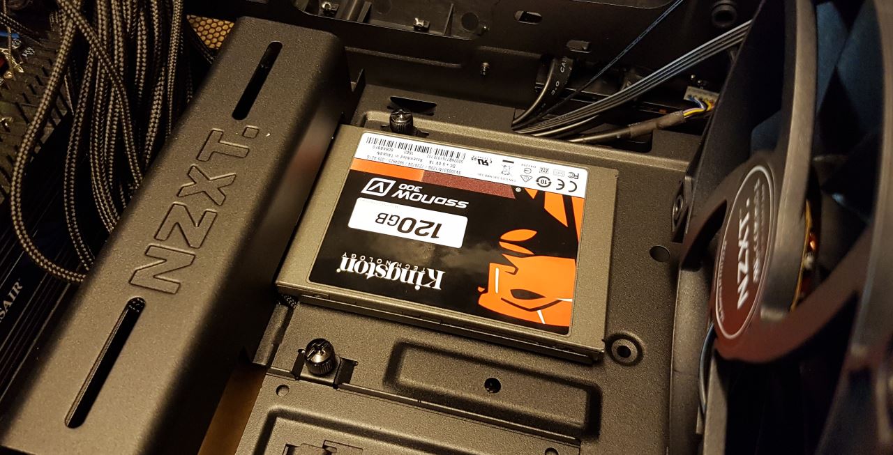 Here we have it installed. Notice one cool feature. To the left of the image the SSD-end with the connectors is hidden beneath the rised metal-thingy in the middle. You attach the power and SATA-cable from the back. Another nice cable management feature.