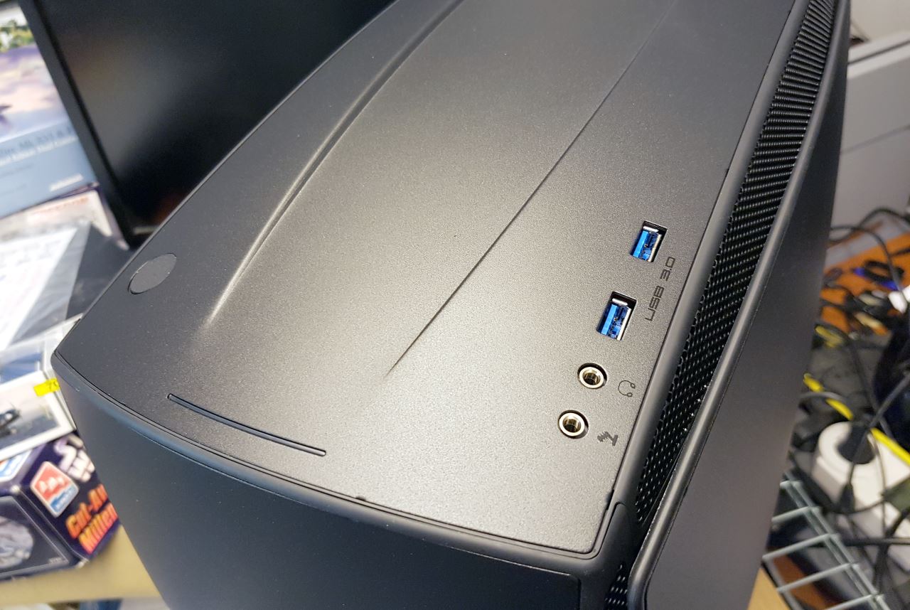 Here we have a view from the top. On the right side we see the various ports while on the right side we have the On/off-button. At the front there is a small light that shines when the computer is on. The whole top can be removed if you want to fit fans or a radiator there.