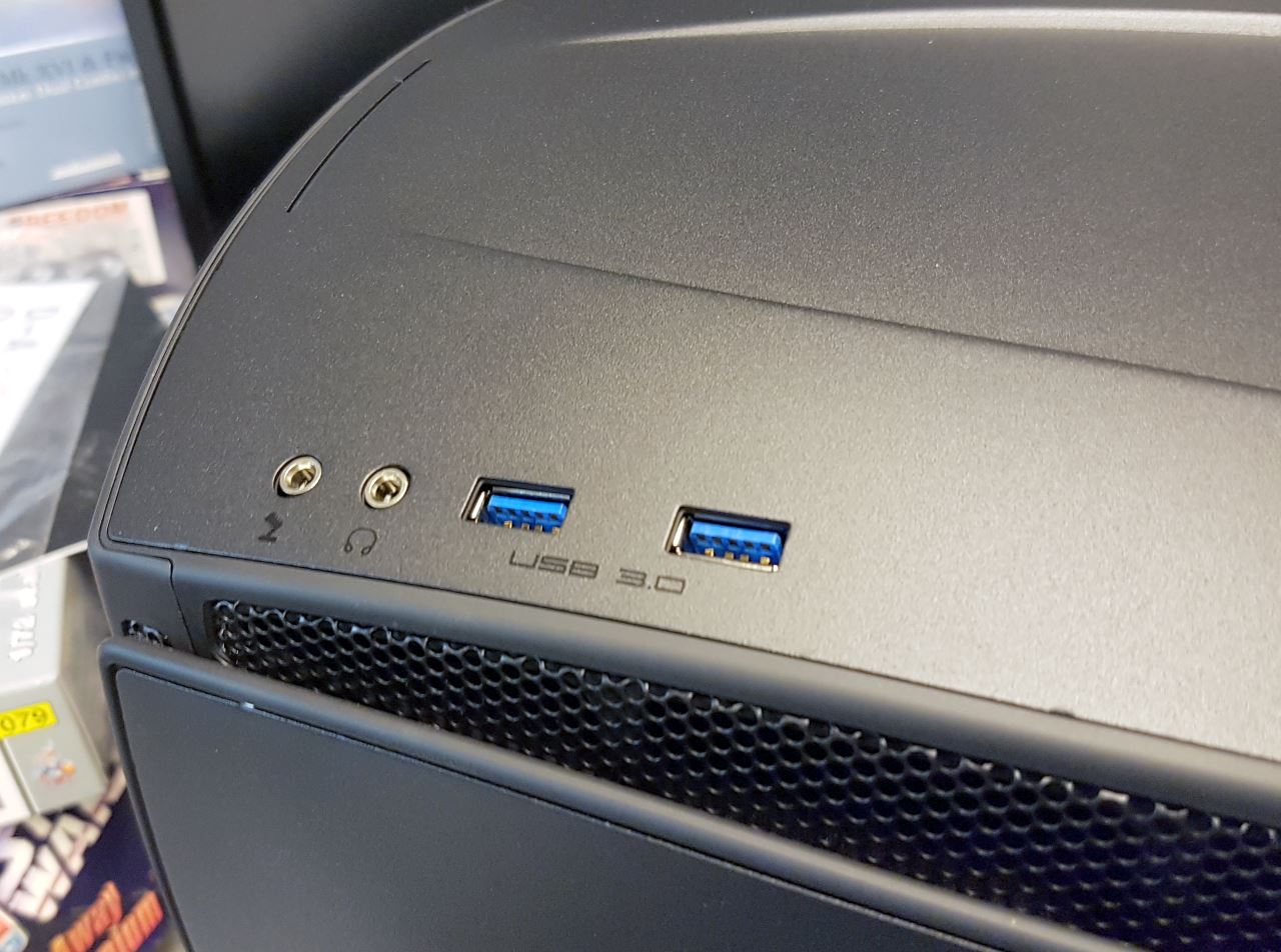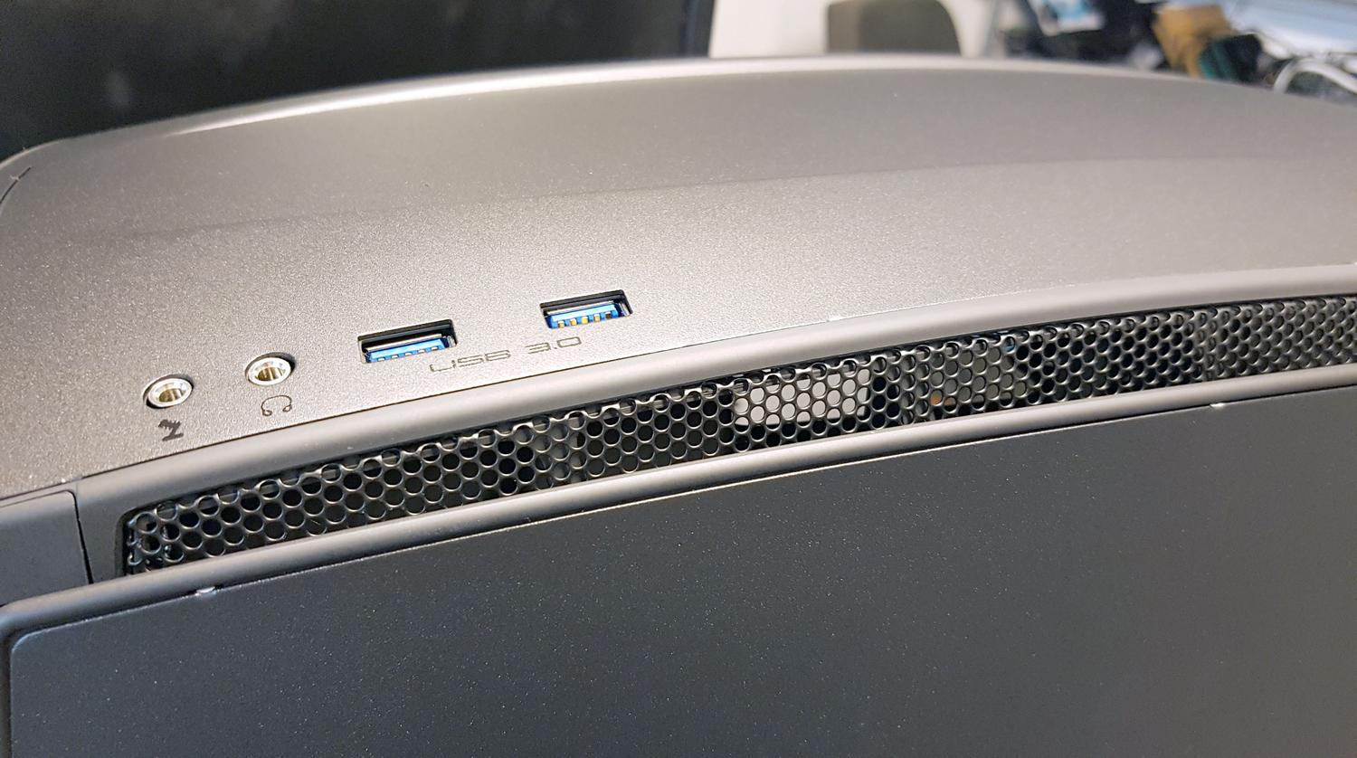 No surprise when we look at the ports at the top. Two USB3.0-ports and headphone/microphone jacks.